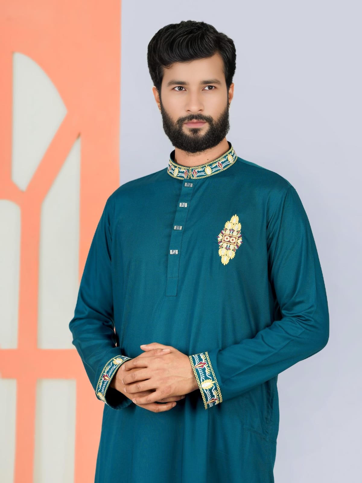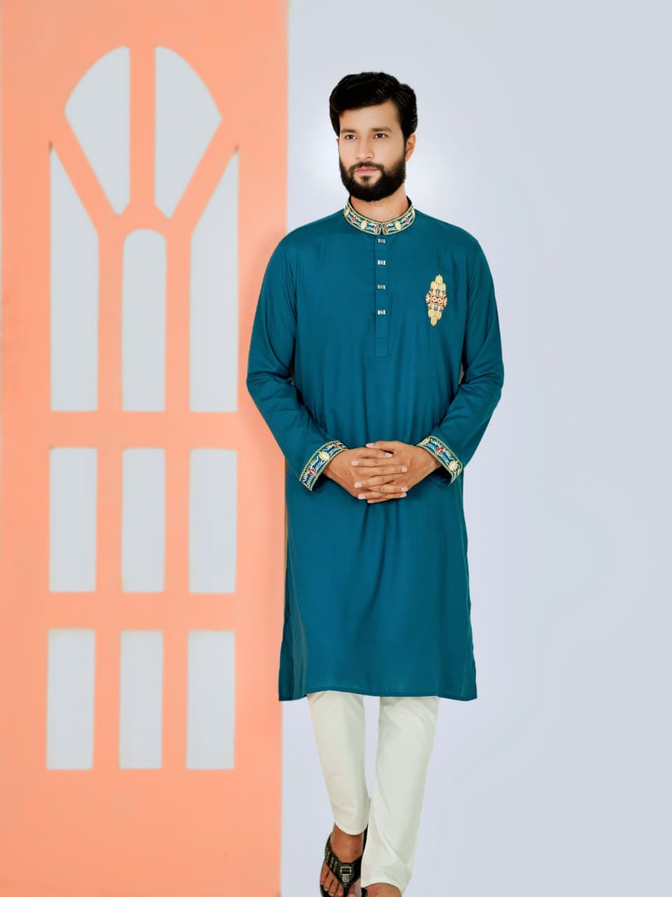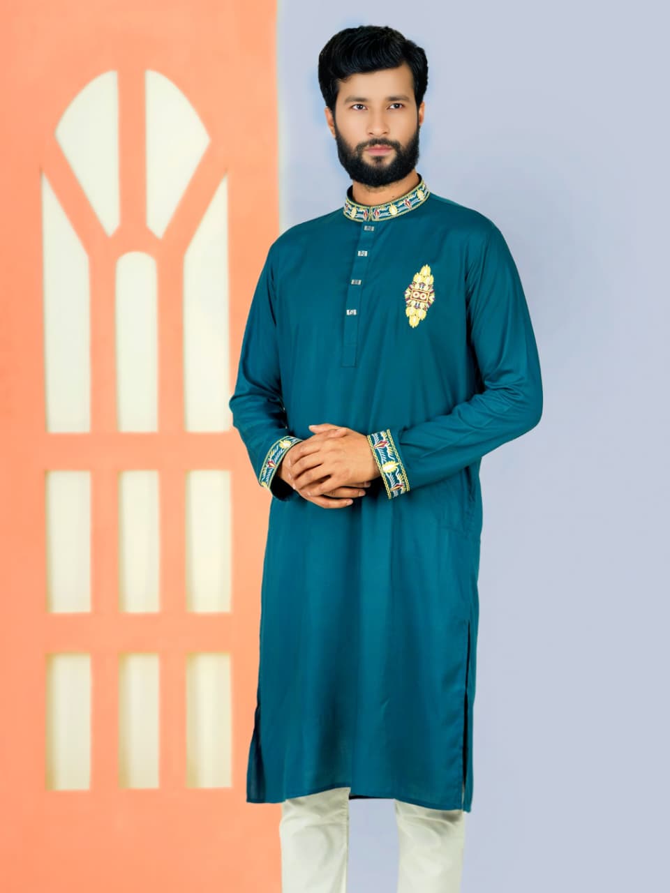 Make a bold yet elegant statement with this Peacock Blue Panjabi, designed for modern men who appreciate refined traditional style. Made from premium cotton fabric, it ensures breathable comfort and a polished finish for any occasion.